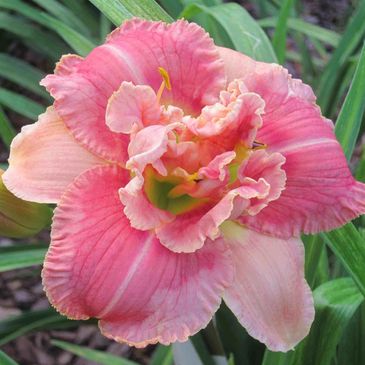 (D537-1) [DIVAS IN DIAMONDS X OUT OF THE PARK] TET 44" 8" SEv M, 5 branches and 24 buds, UF crispate. Best seedling at the 2019 Piedmont Daylily Club Show in 2019. Named for a very special lady my daughter-in-law that over the years has turned into a "daughter. Pink with ruffled cream yellow edges and a vibrant green throat. Tall and gorgeous and a very special daylily. Fertile both ways. DF $50