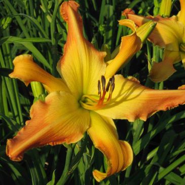 (D575-5) [Doctor Handsome x Line of Fire] TET 40" 8.5" M Dormant UF, 4 Branches, 24 Buds. Combining Gossard and Davisson oranges proved hugely successful in this gorgeous unusual form crispate. Sahara Sunrise takes some of its parents best attributes but manages to have a personality all its own. The color is orange with a huge yellow watermark. What sets it apart is its tendency to quill (especially in hot weather) and its flawless plant habit. Fertile both ways. DF $50