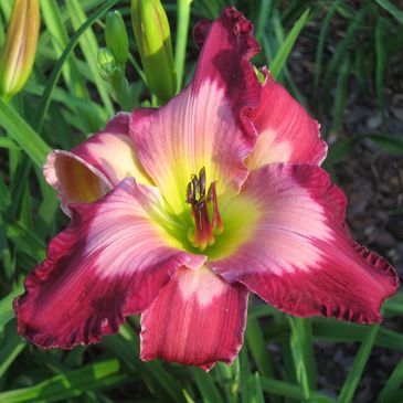 (T1-5) [Crossfire x Paint The Town Red] TET 29" 5.5" ML SEv, 5 Branches & 26 Buds. I have been working in reds for many years and I find improvement in the lines to be almost as difficult as those in black daylilies. Total Power is a ruby red with excellent ruffling and tremendous plant habit. I consider it the best red in my garden bar
