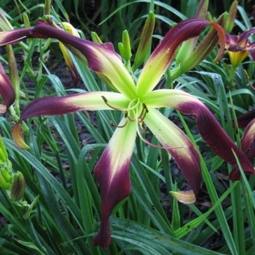 (A275-1) [Purple Crab Legs x Reddy Freddy] TET 45" 8.5" EM SEv, 3 Branches & 18 Buds. Royalty Reigns is a dark red-purple with a huge green and yellow throat radiating out onto the petals and sepals. Registered as a cascade unusual form, the flower is near 10 inches and simply gorgeous. DF $45