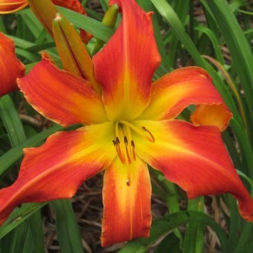 (D529-1) [(Head of the Class x Oda) X KING CRAB] TET 32" 8" Dor M, 5/6 branches and up to 30 buds. An unusual cross brought me this hot orange red. Sometimes it recurves and sometimes it blooms flat. Its color creates a pretty hot spot in the garden either way. Fantastic branching. Fertile both ways. $50 DF